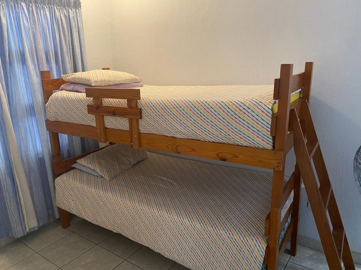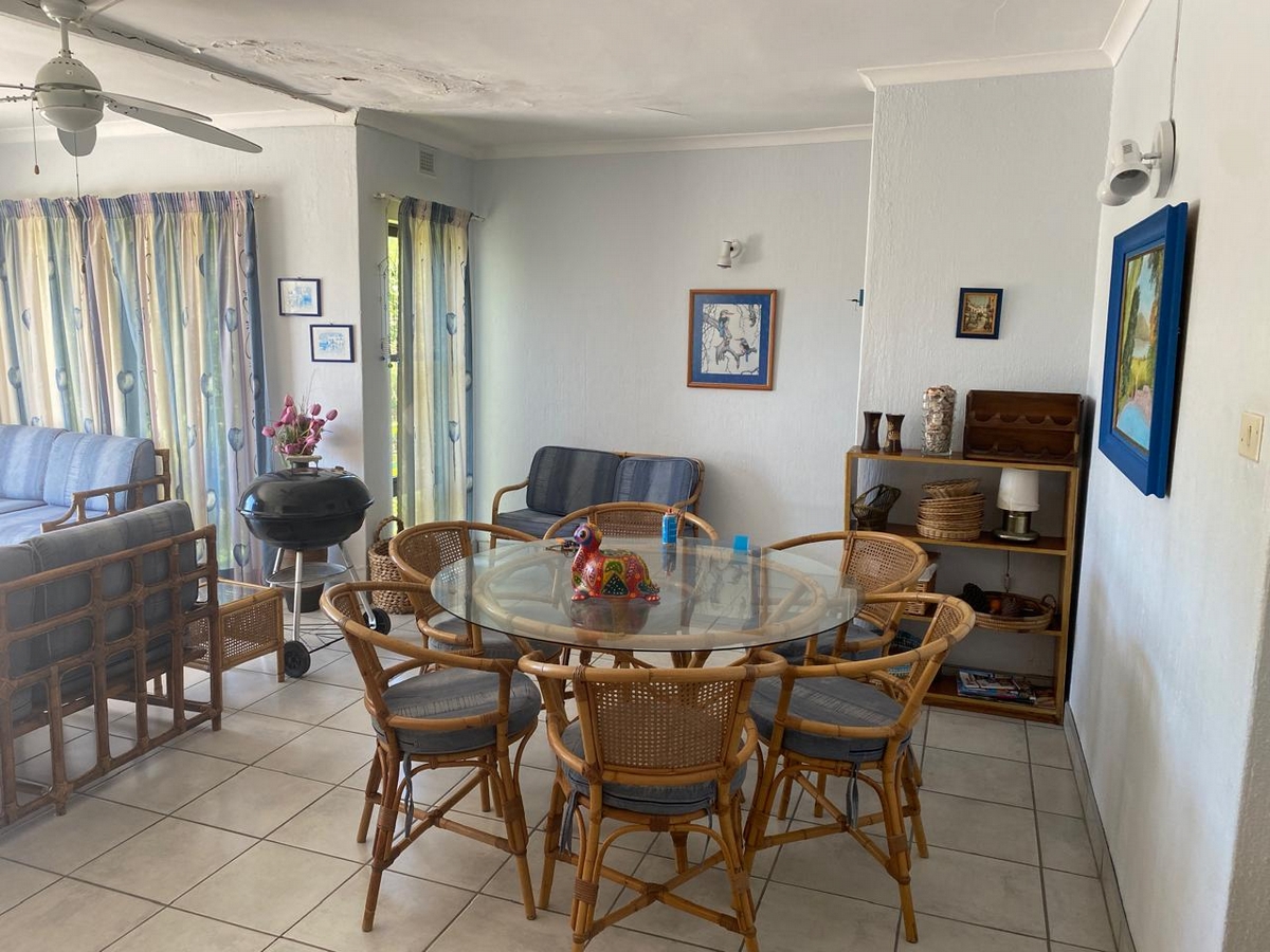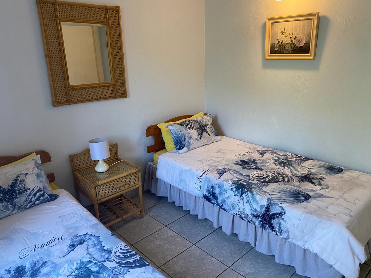 Spacious beachfront unit with sea views in Leisure Bay. Features 3 bedrooms, 2 bathrooms, ceiling fans, Weber braai, and well-equipped kitchen. Complex includes a pool, coin laundry, and secure parking.